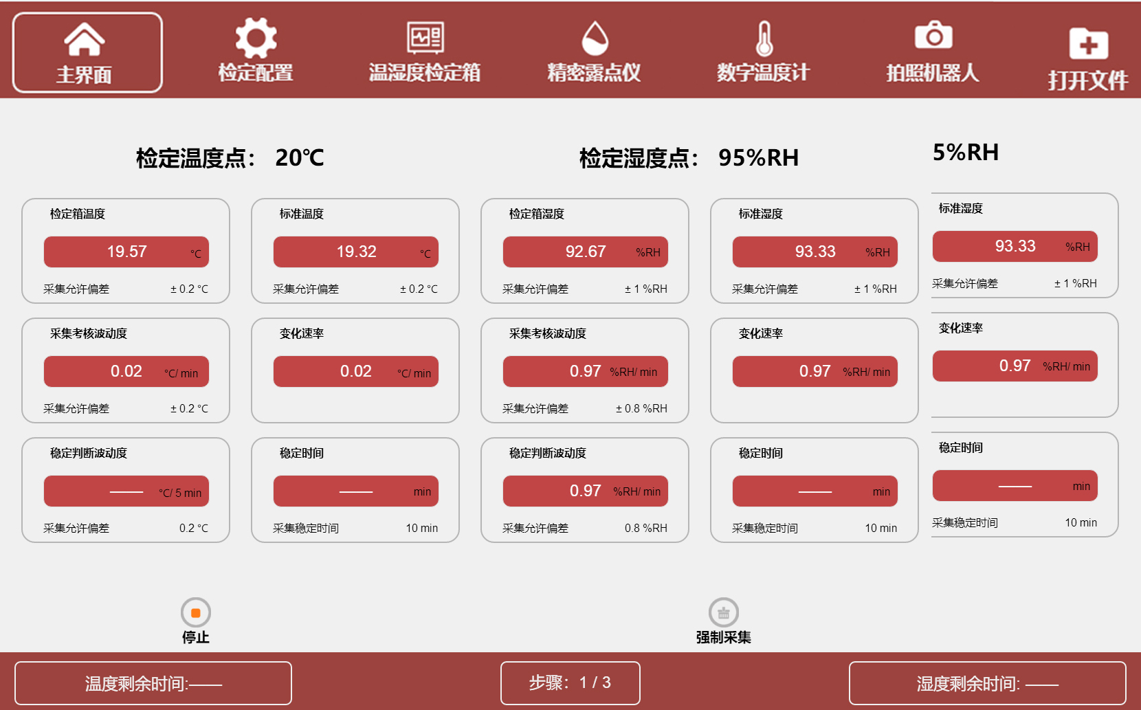 The system automatically controls the temperature and humidity of the calibration chamber, monitors the temperature and humidity values of the calibration chamber in real time through a dew point meter, and automatically makes stability judgments. After the stability conditions are met, the system automatically collects standard data, and the user can manually input the calibration data. After the calibration is completed, the system automatically calculates the calibration results and gives the calibration conclusion.